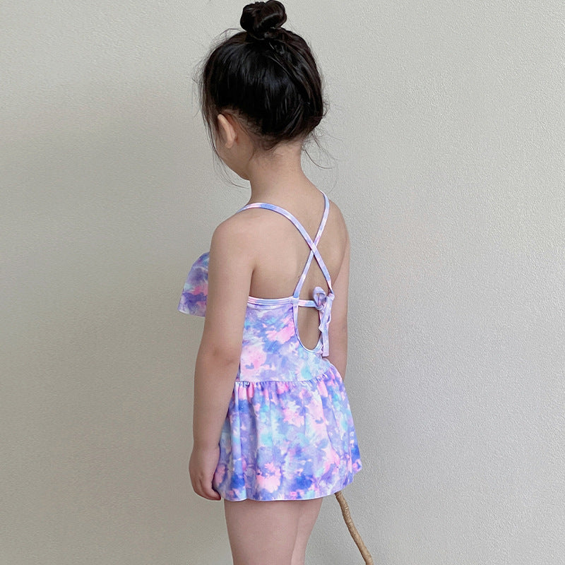 【スイムキャップ付き】キッズ女の子 フリルスカート一体型ワンピース水着 花柄・パープル|日差し対策・塩素に強い・吸汗速乾・通気性 2-10歳