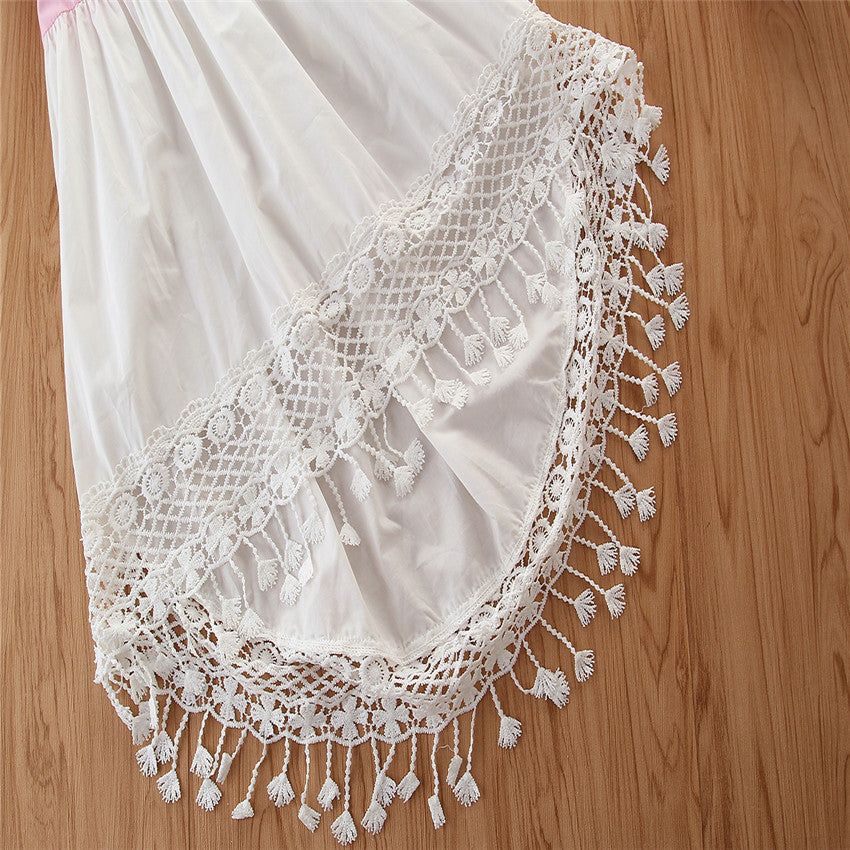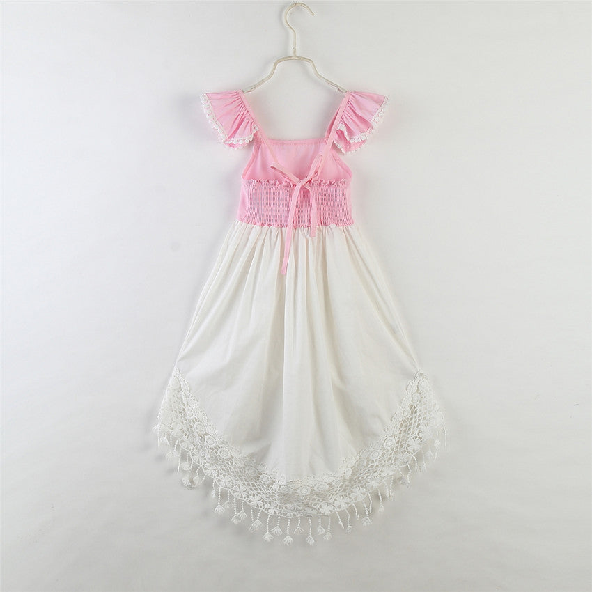 軽やかに揺れるレースタッセル裾で夏のおしゃれが決まる 女の子イレギュラーヘムワンピース フリル袖 コットン 110~160cm
