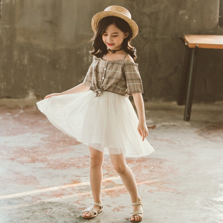 クラシックなチェック柄とふんわりチュールが上品に映える 女の子オフショルダー風ワンピース コットン混素材 110~160cm