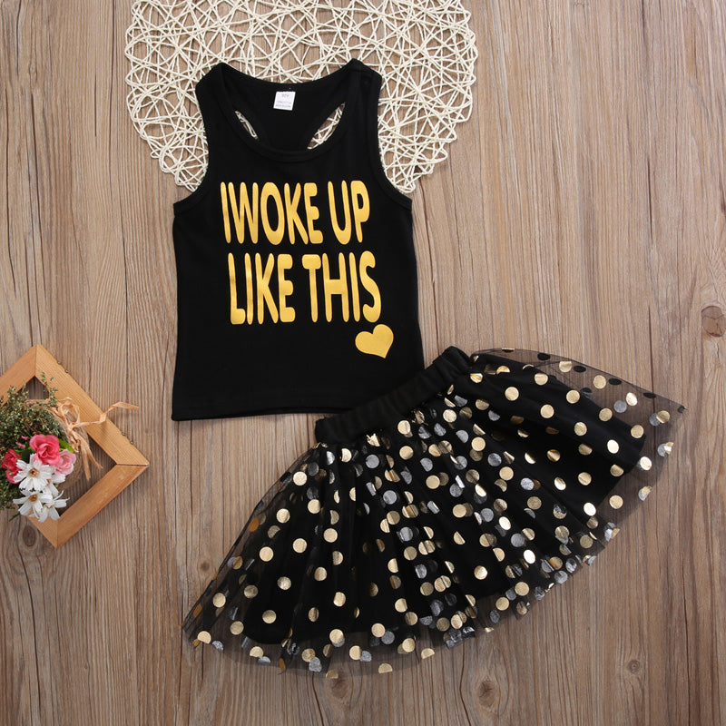 きらめきドットスカートで特別感が増す 女の子ノースリーブベスト&スカートセット ロゴプリント コットン 80~120cm