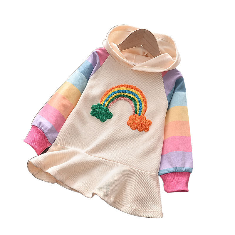 ふんわり可憐に春秋コーデが完成する 女の子長袖ワンピース レインボー刺繍 ボーダー袖 フード付き コットン素材 90~130cm