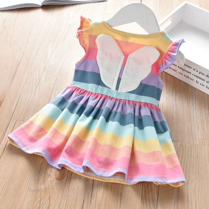 夏にさらっと軽やかに映える 女の子ノースリーブワンピース レインボーストライプ 背中モチーフ付き コットン混(綿50%) 100~140cm