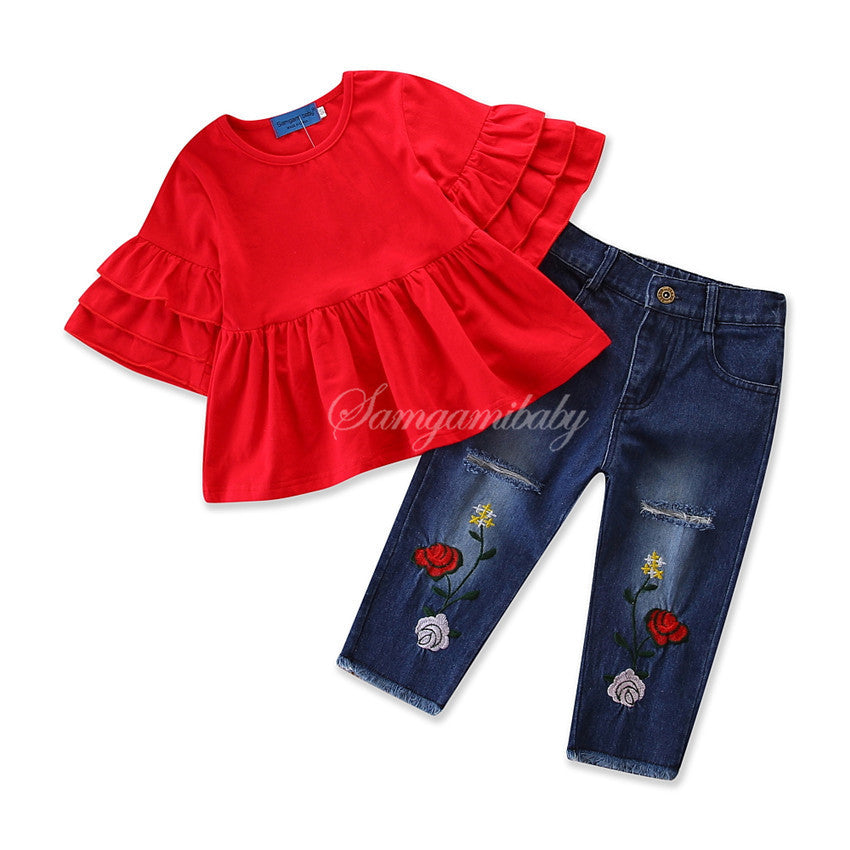 華やかフリルで主役になれる 女の子トップス&花刺繍デニムパンツ上下セット コットン混 100~120cm