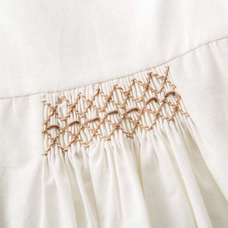- ◈ スモッキング刺繍: 胸元に立体感が出て、写真でも表情がきれい