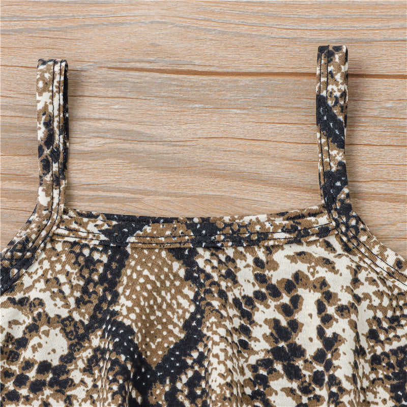甘辛パイソン柄でおしゃれに決まる 女の子ノースリーブトップス&フレアパンツ上下セット ブラックプリント コットン95% 80~110cm
