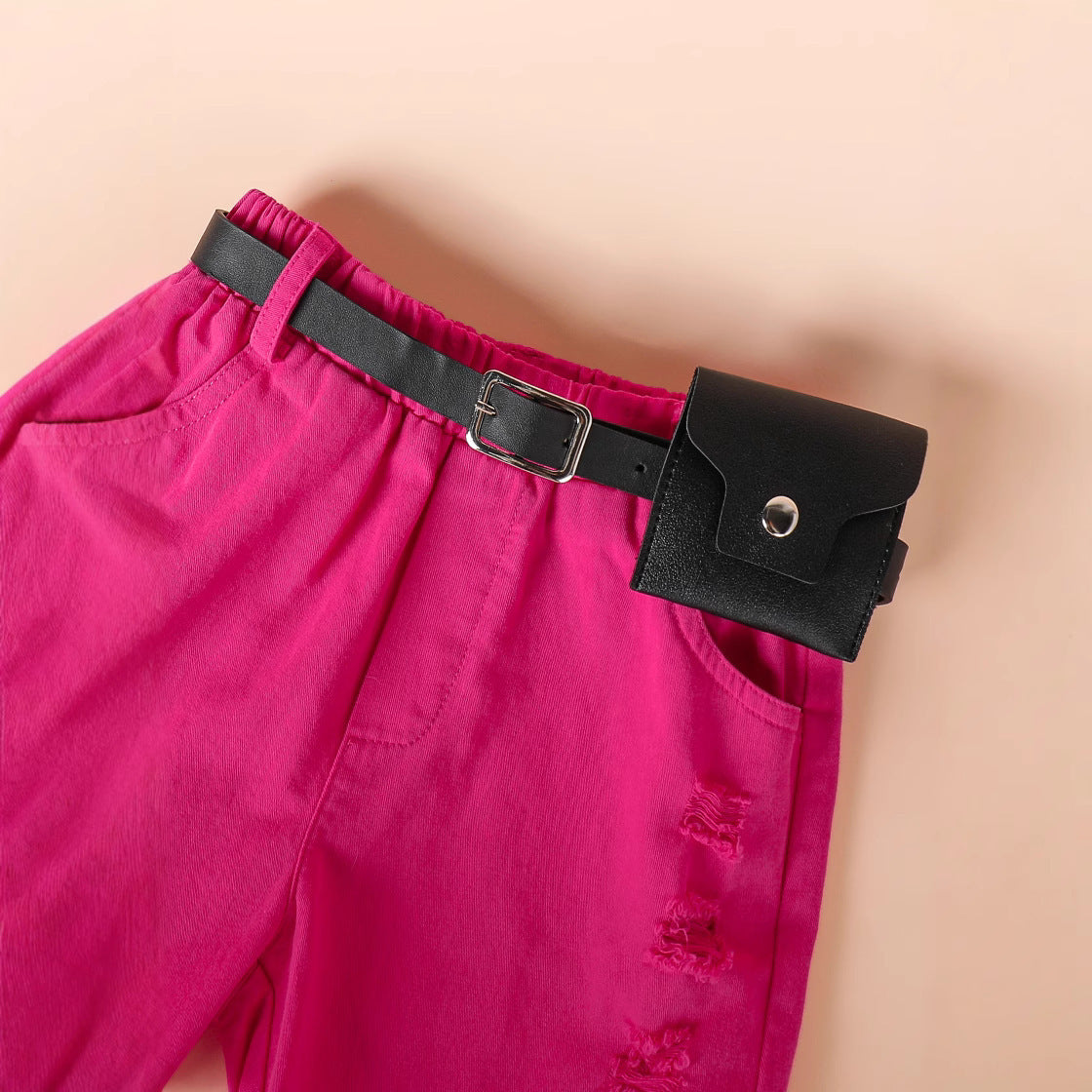 甘さをひとさじプラスできる 女の子半袖Tシャツ&デニムショートパンツ&ベルトセット チュールリボンデザイン コットン素材 4~7歳