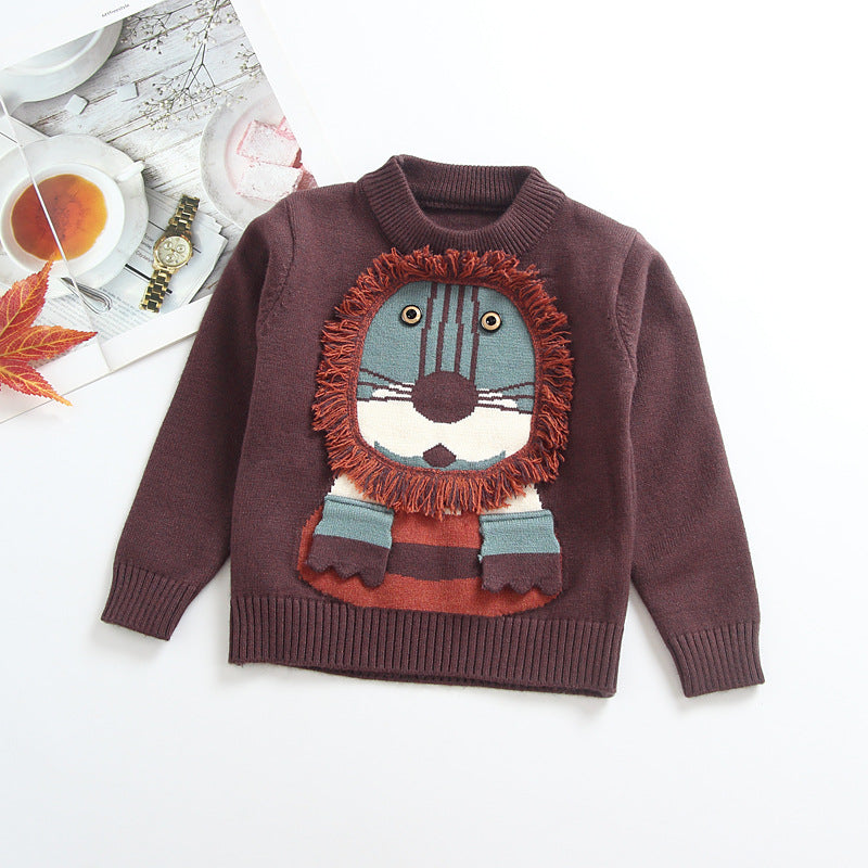 立体ライオンモチーフが主役になる 子ども長袖ニットセーター フリンジデザイン ラウンドネック ニット素材 80~110cm