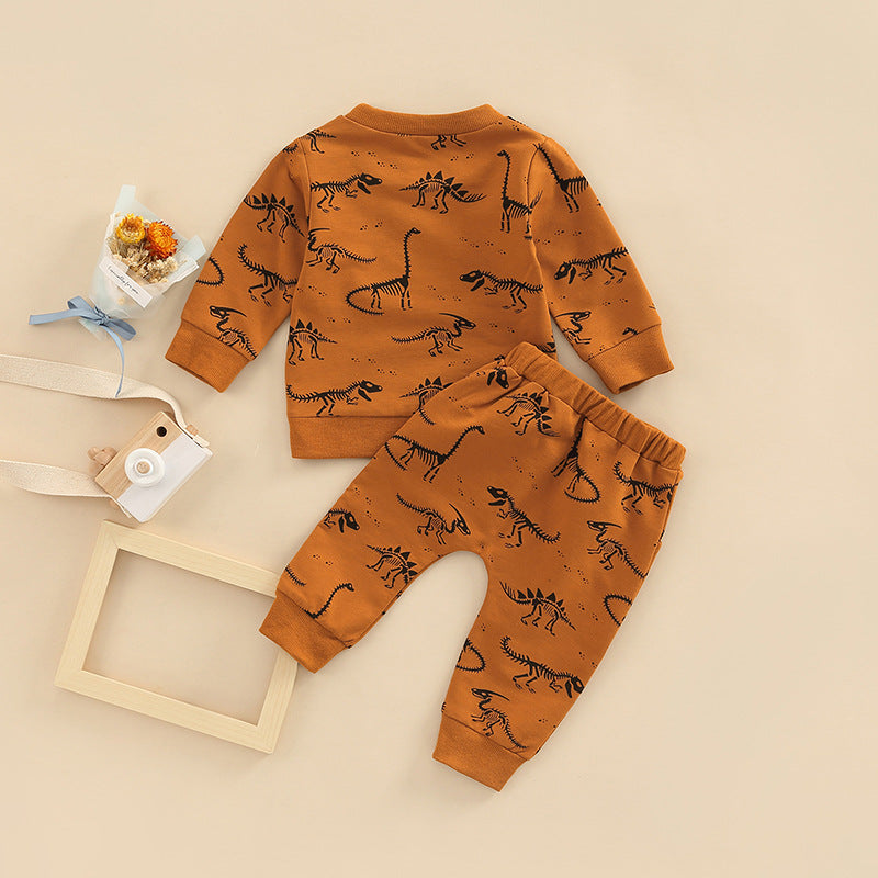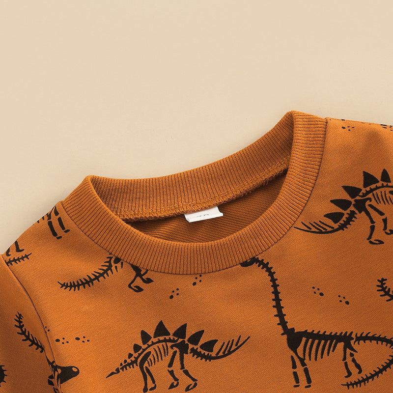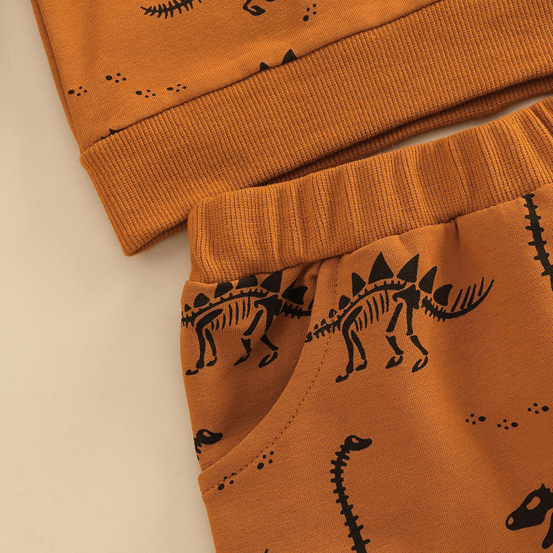 のびのび動けて毎日が楽しくなる 子ども長袖トップス&ロングパンツ上下セット 恐竜ボーンプリント コットン ライトブラウン 70~110cm