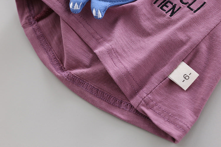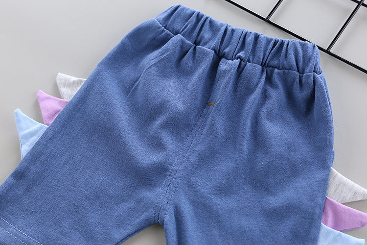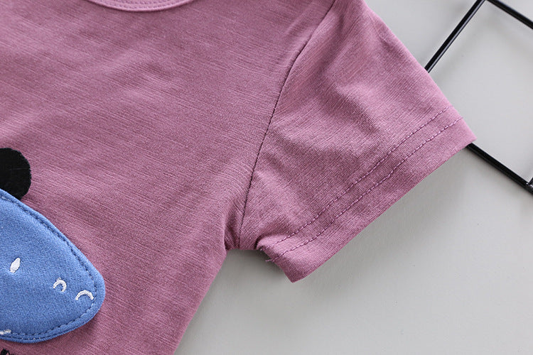 元気いっぱいに映える 子ども半袖上下セット 恐竜カートゥーンアップリケ 五分丈ショーツ コットン95% 80~110cm