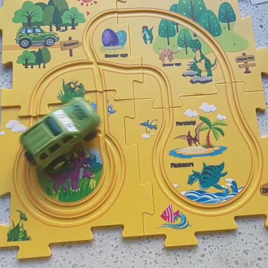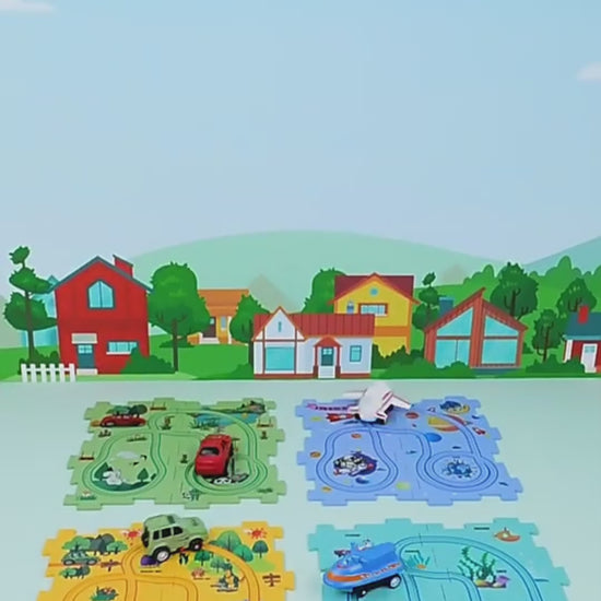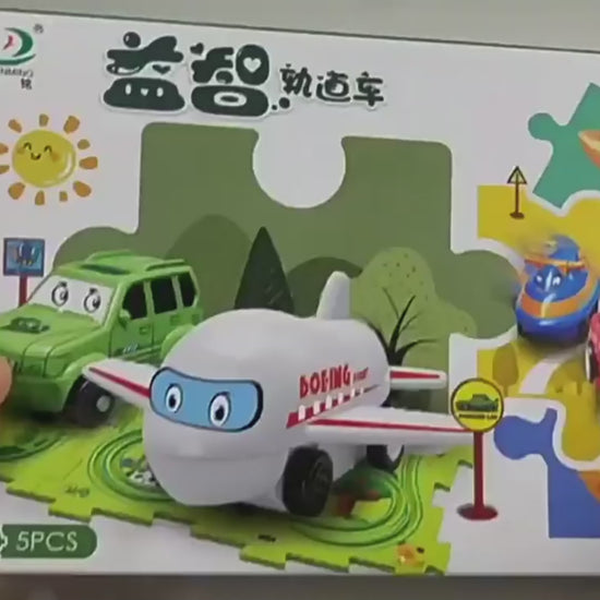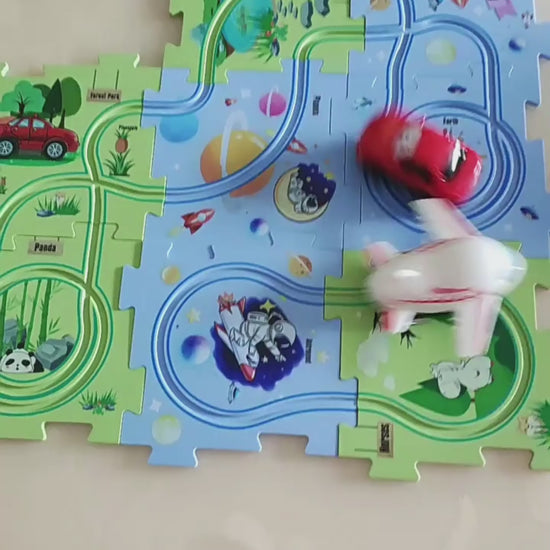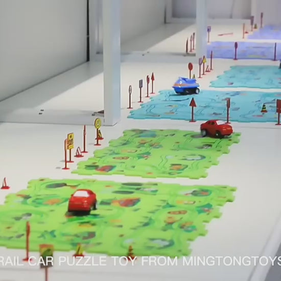 パズルもレールカーも大好きな子どもにぴったりの、考えて組み立てる電動パズルレールカーです。マス目状のパズルボードをつなげて、溝のついたルートを自由にレイアウトすると、小さな電動カーが自動で走り出します。