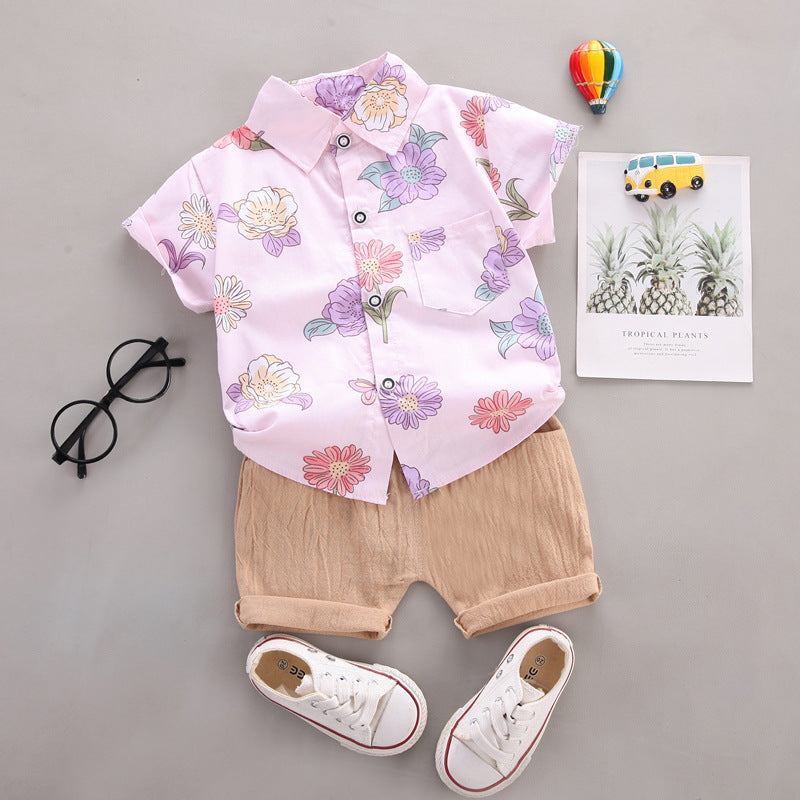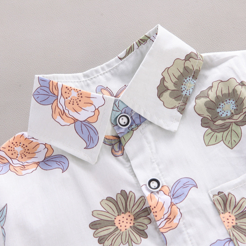 さらっと涼しく夏コーデが決まる 子ども半袖襟付きシャツ上下セット 韓国風フラワー柄 コットン素材 80~110cm