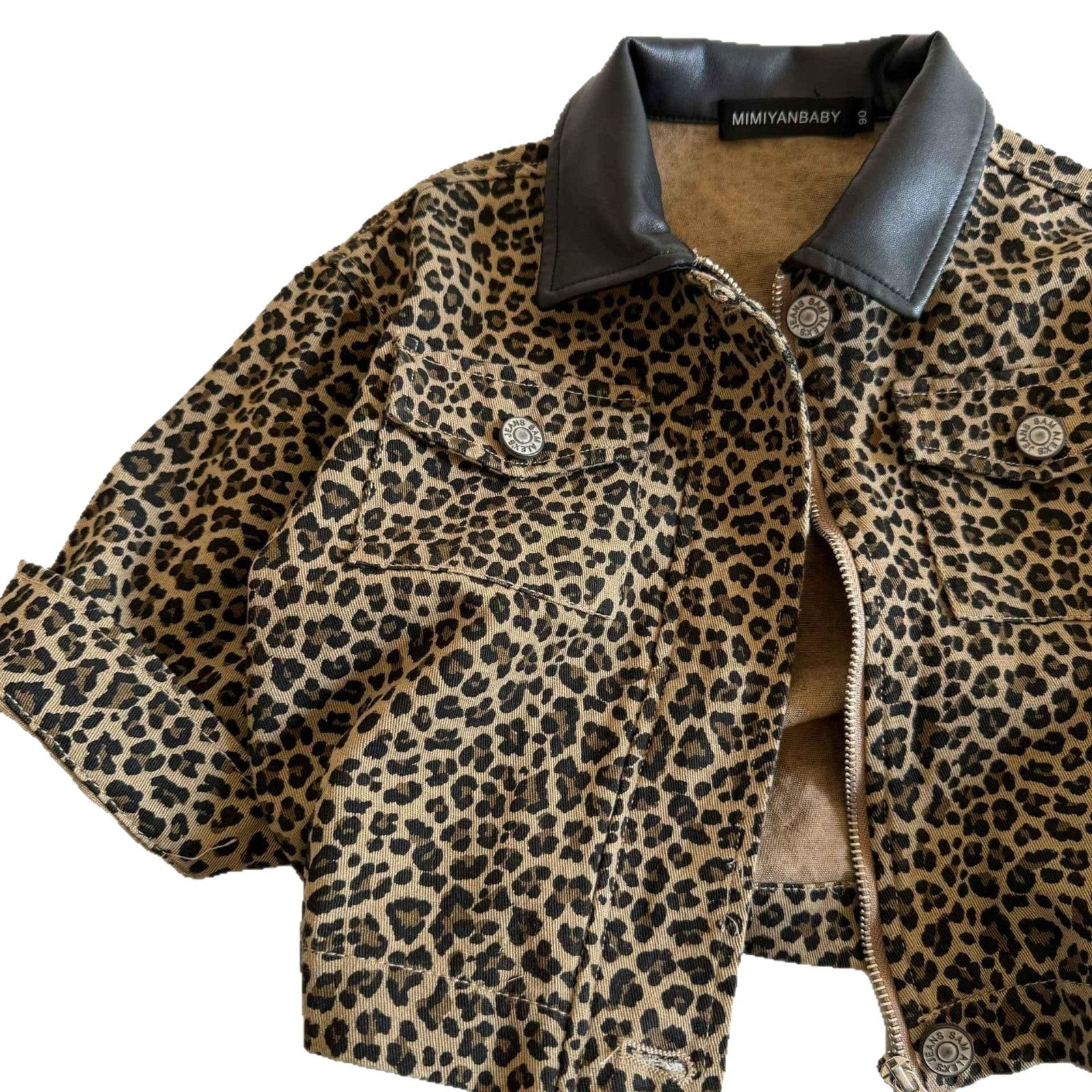 こなれレオパードで即おしゃれ見え 子ども長袖ショートジャケット レオパード柄×ブラック襟 ポリエステル混裏地 90~140cm