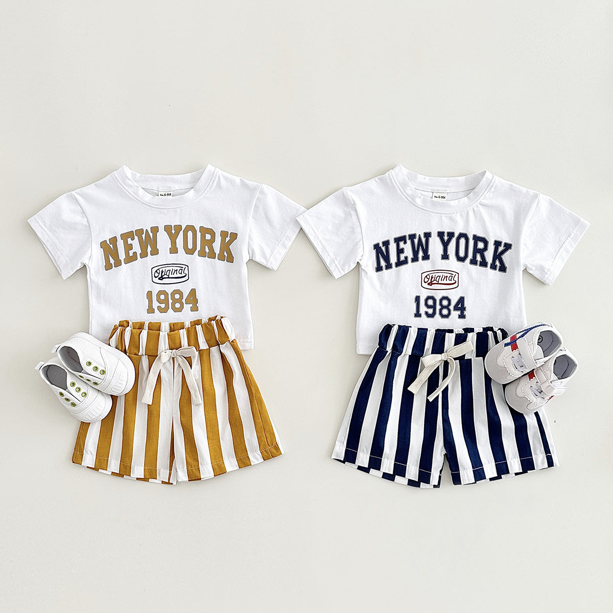キッズ 夏用 半袖Tシャツ&ショートパンツ 2点セット NEW YORK レタープリント コットン 韓国風 66〜100cm