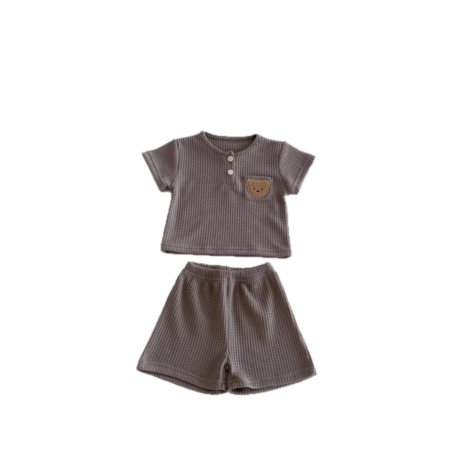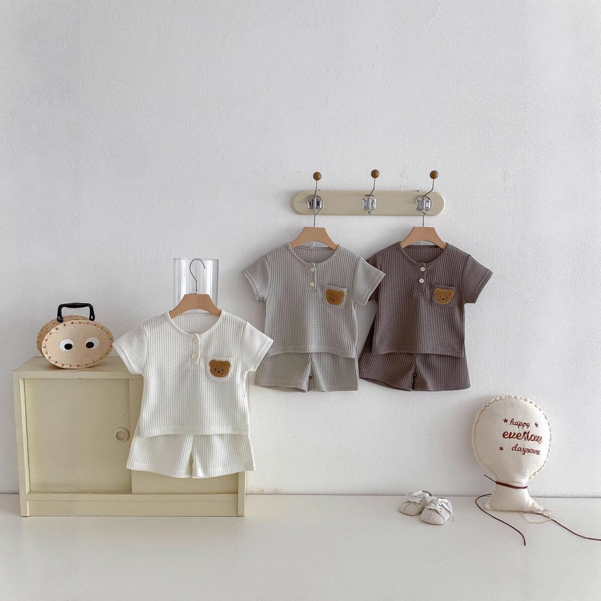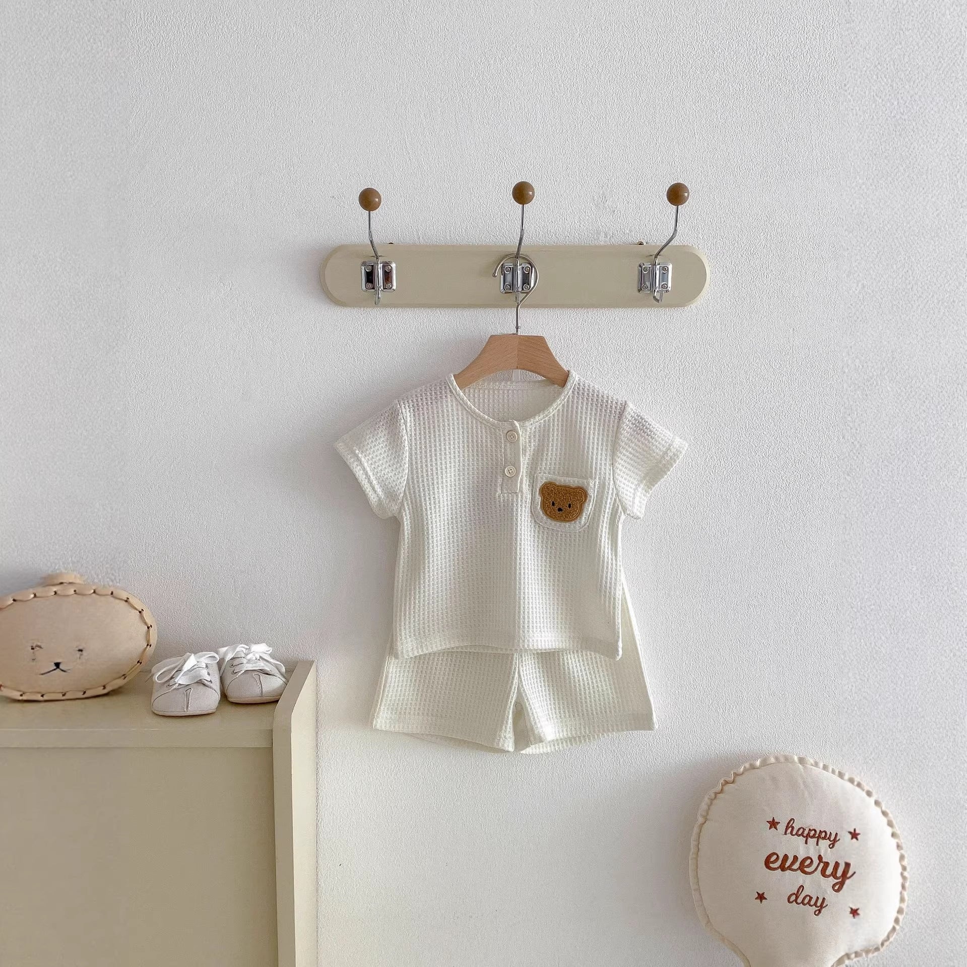 さらっと涼しく毎日コーデが整う 子ども半袖上下セット くまワッペン付きワッフル調 コットン素材 73~110cm
