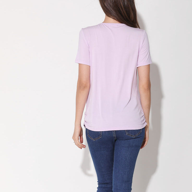 なめらかなモダール素材を使用し、リラックス感のあるカジュアルスタイルに。授乳口付きのサイドオープン仕様で、妊娠期から産後まで長く使える一枚です。
