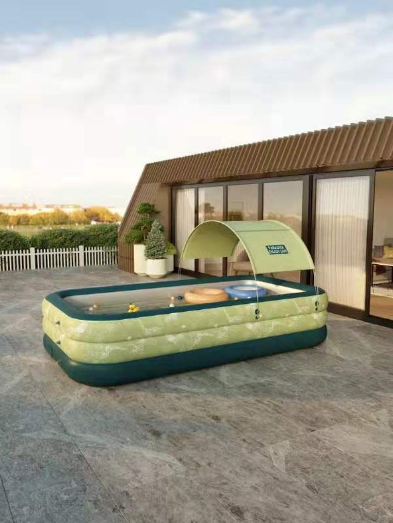 シェード付きのワイヤレス自動膨張スクエアインフレータブルプールは、屋外の水あそびを「涼やかなひと区画」に変えてくれる一台です。