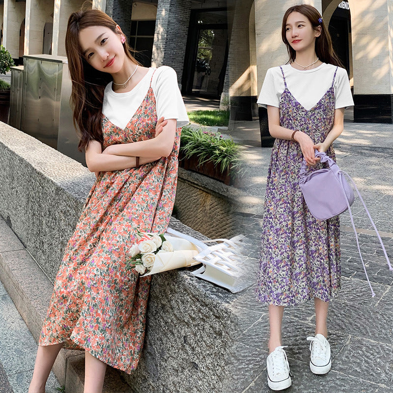 夏も軽やかに着映える マタニティワンピース レイヤード風 小花柄 半袖 ラウンドネック コットン混素材 M〜XXL